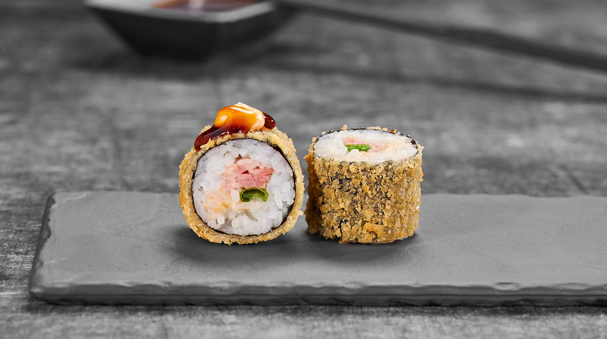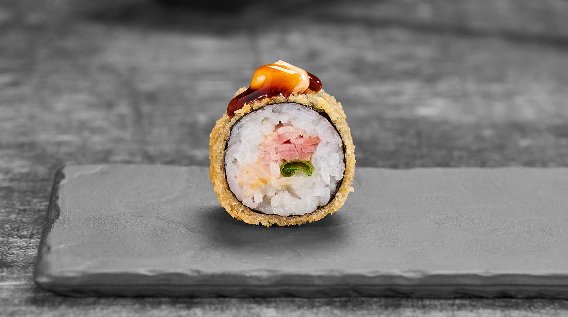 Состав: Бекон, спайси соус, зеленый лук, унаги соус, темпурный кляр, панировочные сухари, рис, нори *Внешний вид блюда может отличаться от фото на сайте.