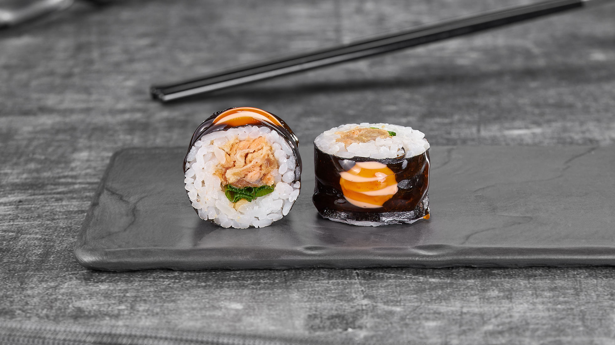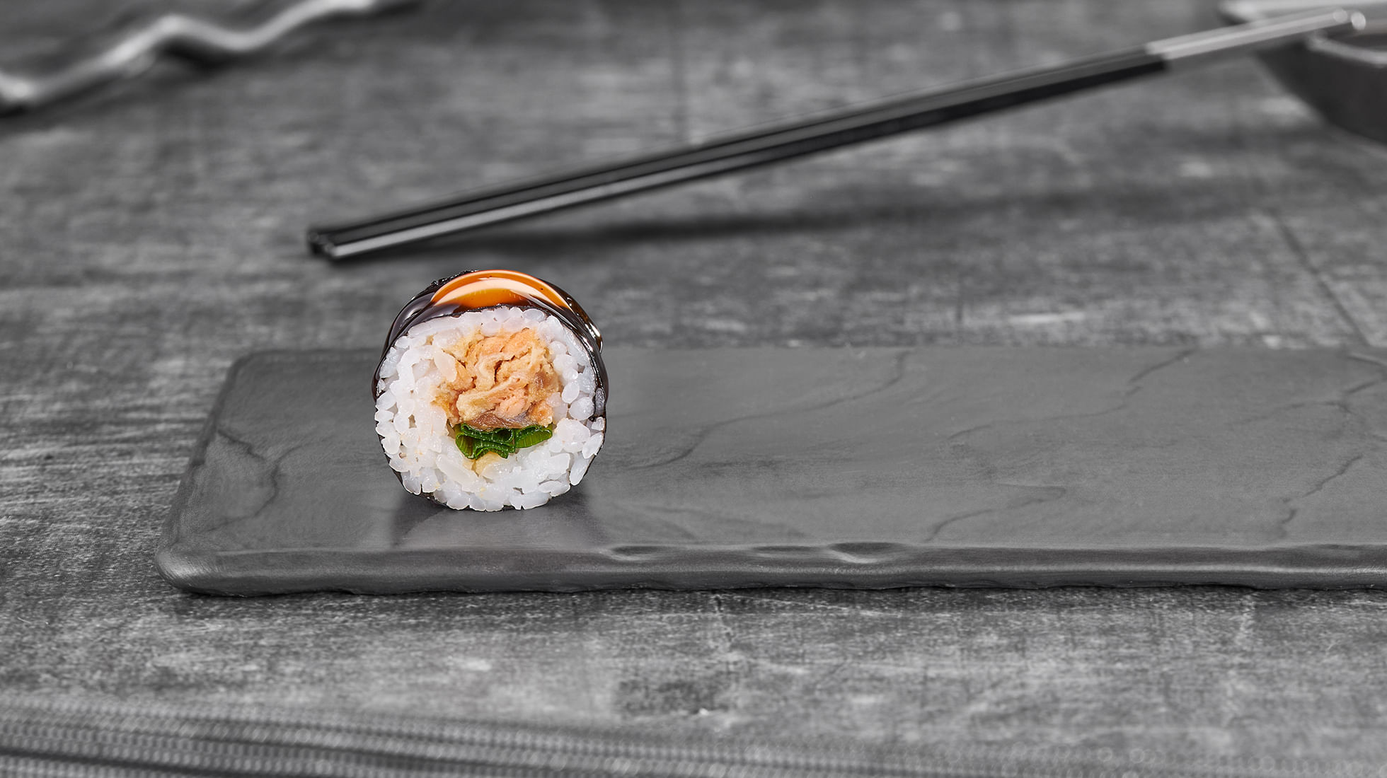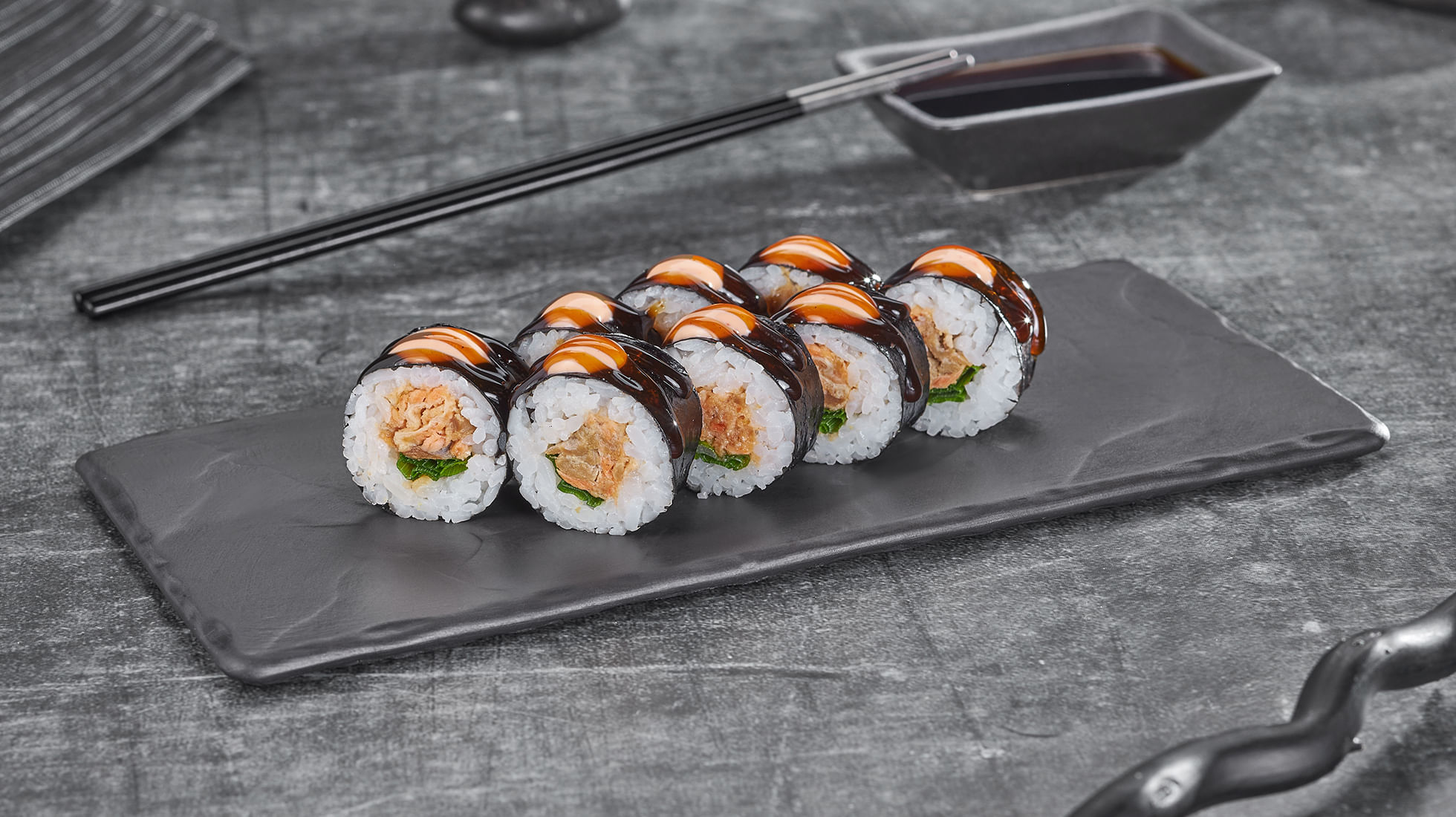 Мини-формат, но большие амбиции. Лосось терияки, зеленый лук, соус спайси и унаги собрались для быстрого вкусового удара. Небольшой, шустрый и исчезает с тарелки раньше, чем ты успеешь сказать «ещё один».